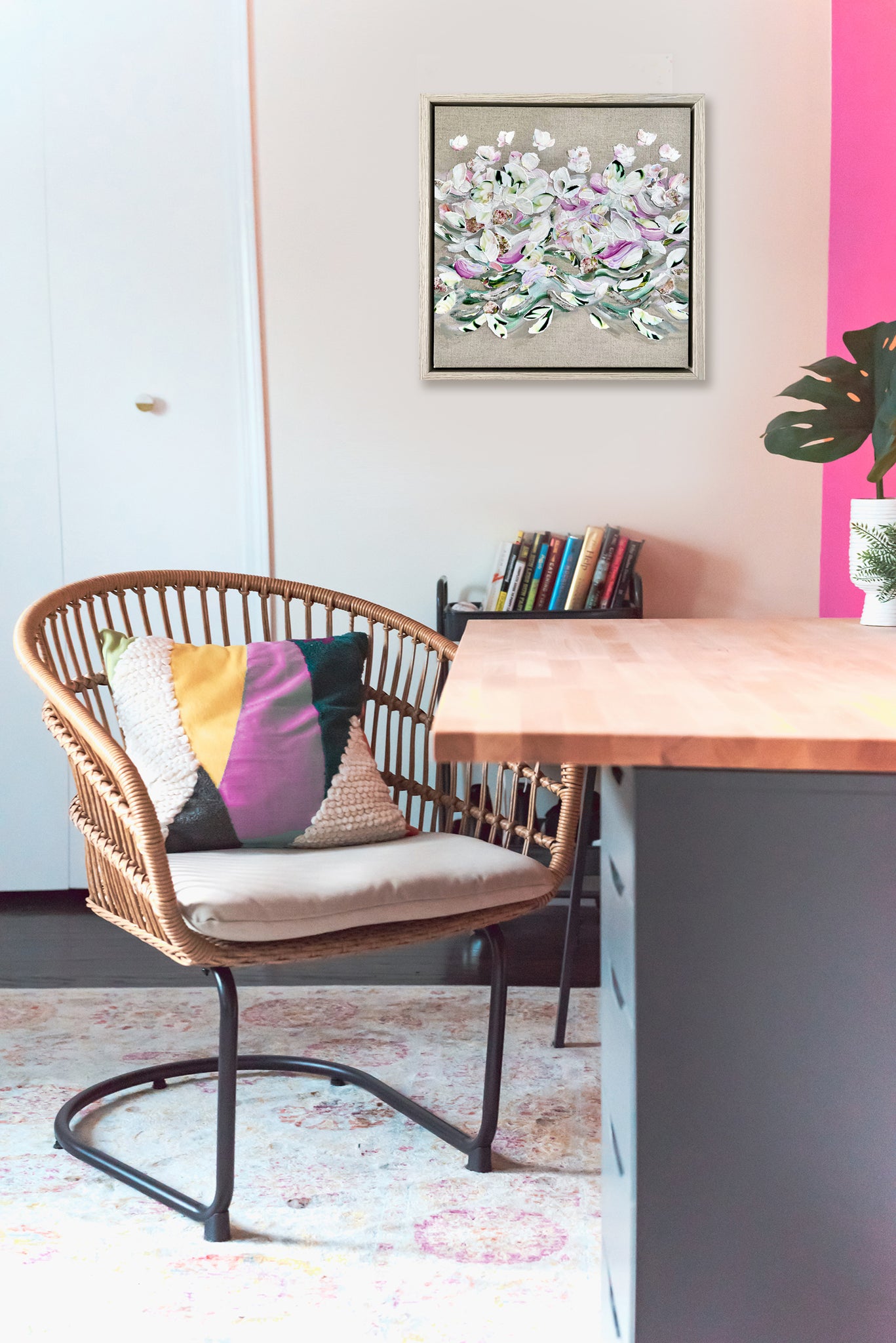 This artwork is sold framed in a light wood veneer tray frame
