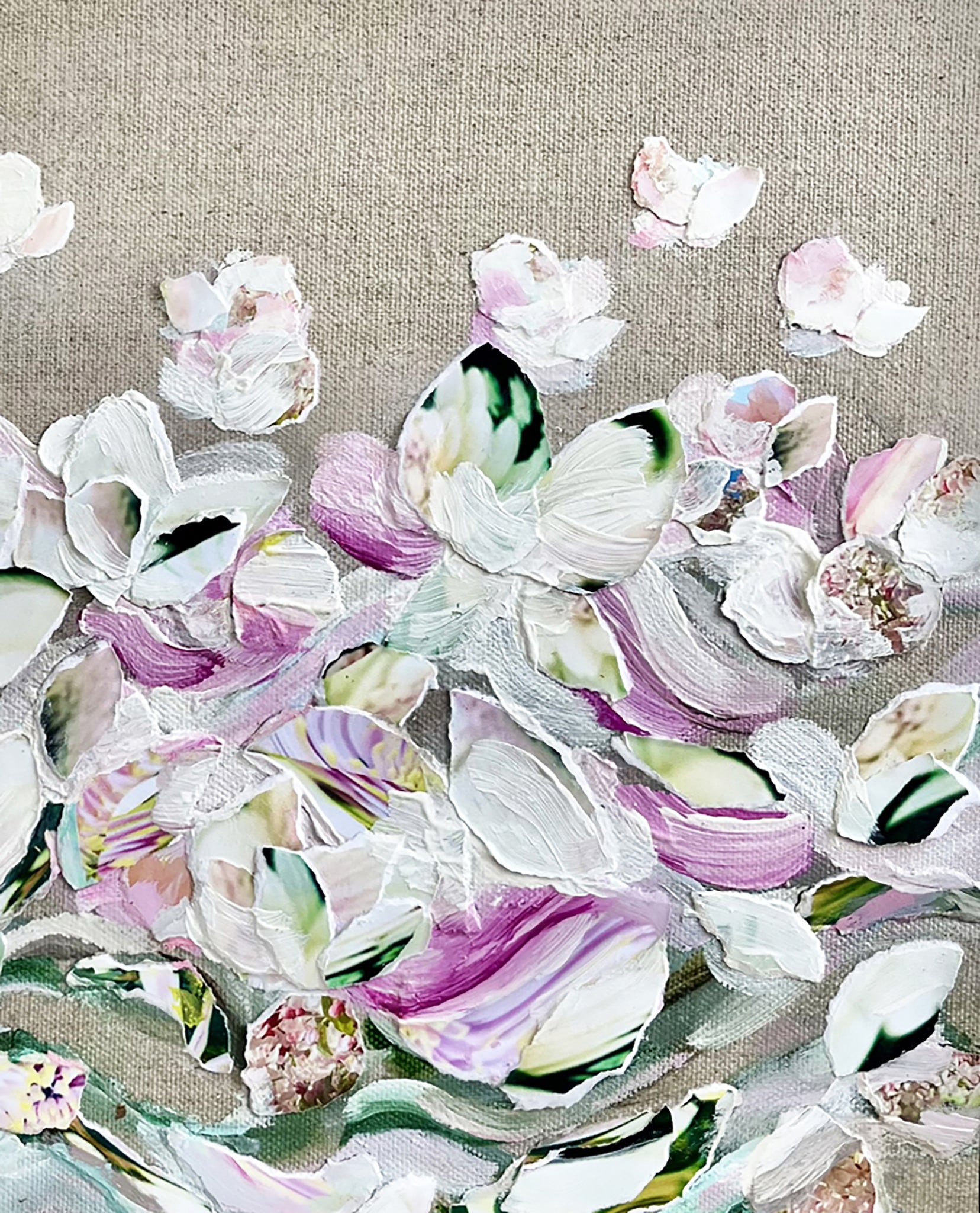 To be with you #59 is part of a series of abstract floral paintings made up of acrylic brush strokes combined with layers of paint and collage.