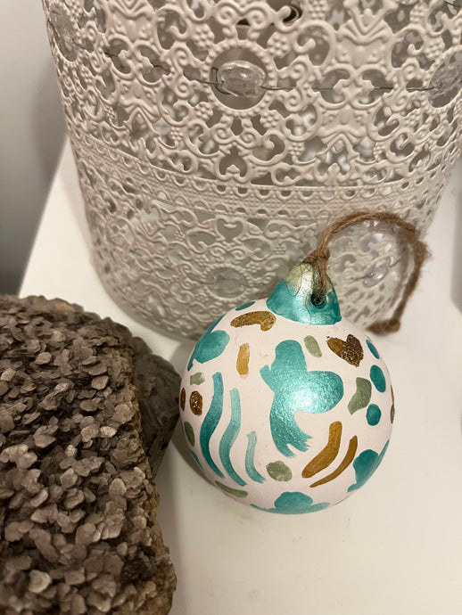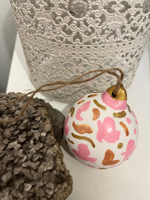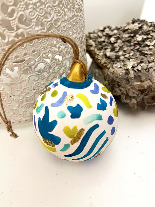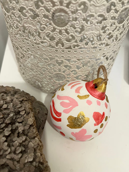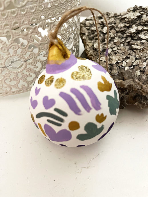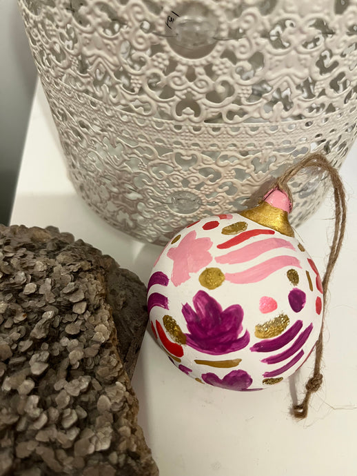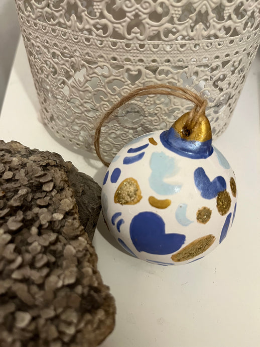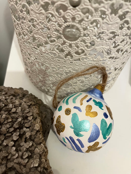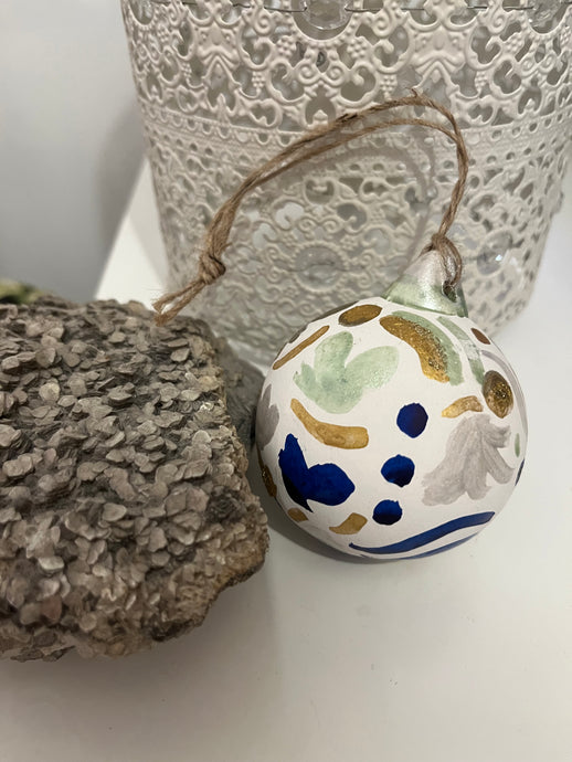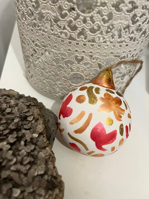 Beautifully hand painted ceramic baubles with glitter elements for the festive season. All baubles are one off individually hand painted small pieces of art. Hand painted design using inks, acrylics and glitter.